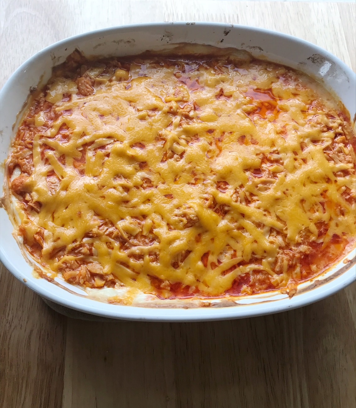 To layer the dip together, in a baking pan (I used a 1.5 quart casserole dish, but an 8x8 pan or 9x9 baking pan would also work) spread about half of the cream cheese/dressing mixture on the bottom of the pan, then add half of the chicken/hot sauce mix on top and then sprinkle half of the cheddar cheese on top of that. Then layer the remainder cream cheese/dressing mixture on top, add the remainder of the chicken/hot sauce on top, and finally sprinkle the remainder of the cheese on top.