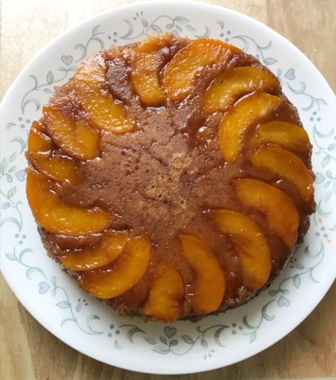 I love peaches. They are my favorite fruit, and every year I look forward to the day when the peaches are finally ripe at the local farms and I can go buy them. Once they are finally available, I tend to buy way too many and then need to come up with fun ways to use them. One of my favorites is a peach upside down cake.