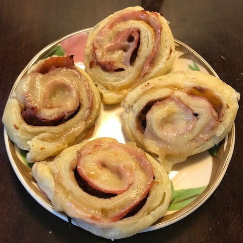 Roll the thawed pastry out onto a flat surface. Spread mustard on the pastry sheets and then spread the raspberry preserves on top of the mustard. Cover pastry with a layer of prosciutto, then cheese. Roll the sheets, beginning at the long side. Cut into 1 inch thick slices. Arrange the sections on the prepared baking sheet.