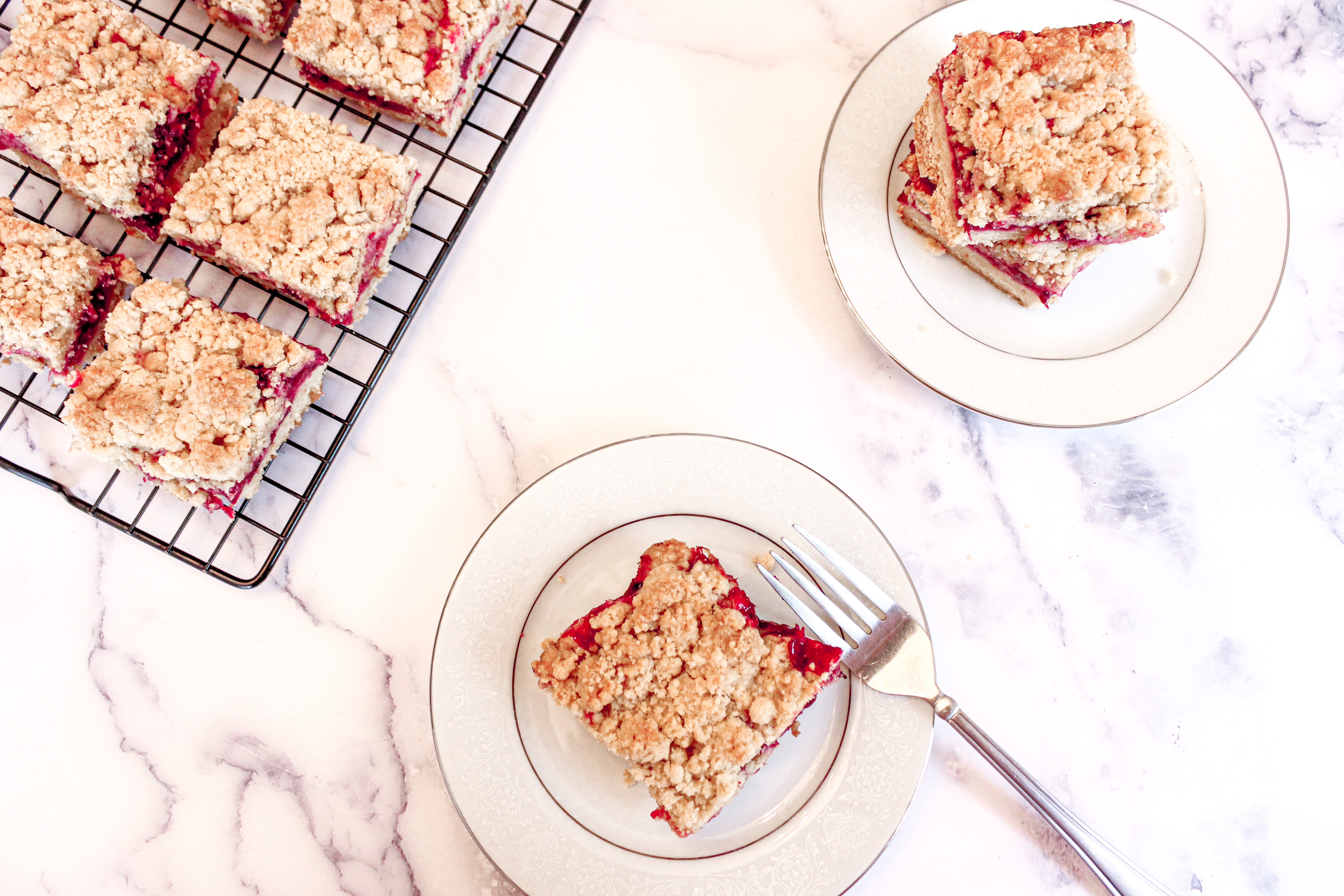 These bars use the same batter for the crust and the crumble. You just have to make the one batter, toss the fruit with a few ingredients and put it together and bake it. So it ends up being a really easy recipe to make, but they turn out to be really impressive tasting.