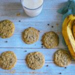 Cream together the butter, white sugar, and brown sugar. Add in the mashed banana, vanilla extract, baking soda and salt and stir everything together until combined.