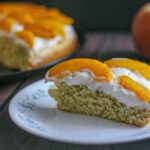 Once the cake is completely cooled, spread the whipped cream over the cake in an even layer. Top with the peach mixture. Serve immediately, or keep covered in the refrigerator until serving.