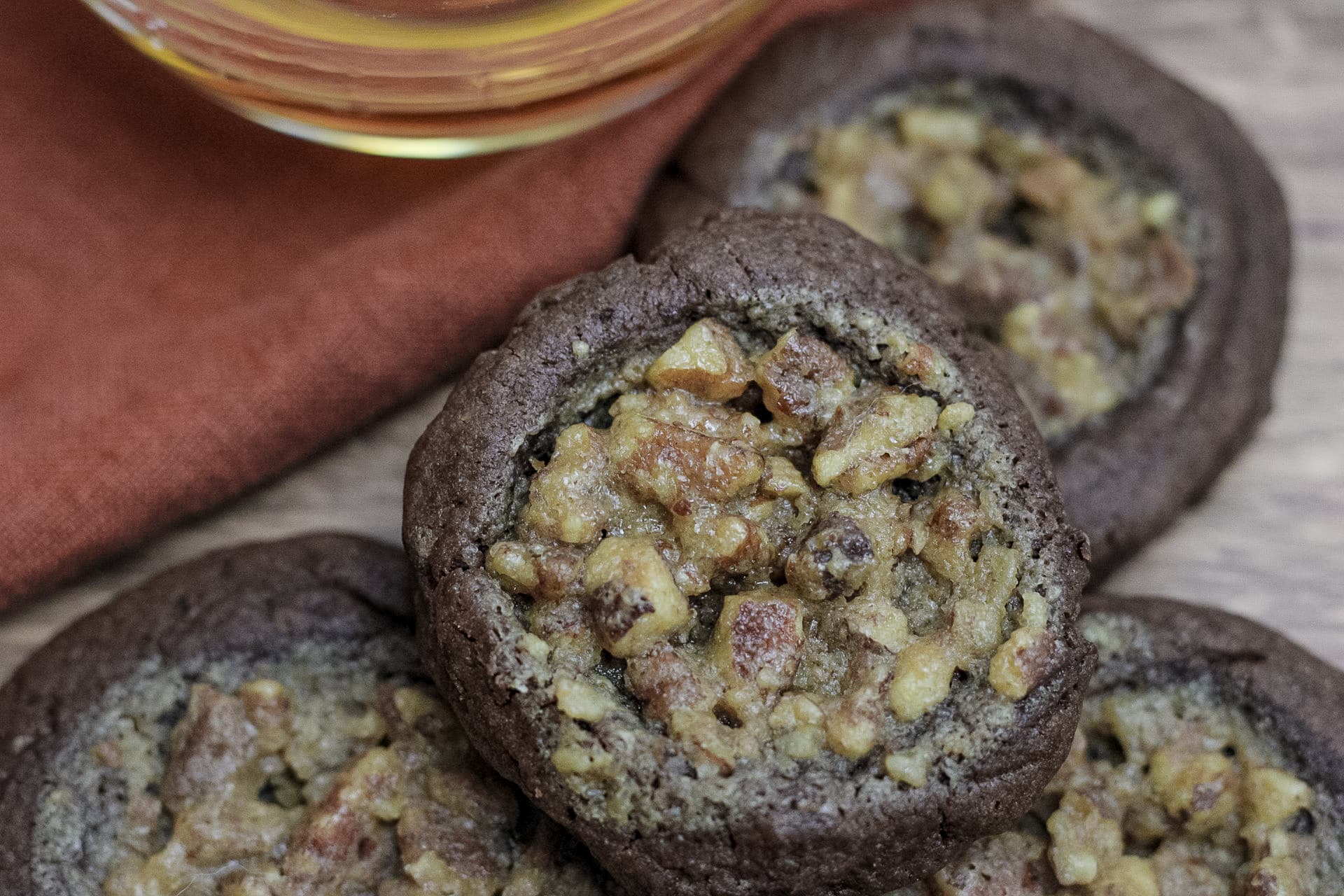 These Chocolate Bourbon Pecan Pie Cookies are easy to make and have all the flavors of pecan pie in them. The cookies are filled with a pecan pie filling, so they also look like cute little pies!