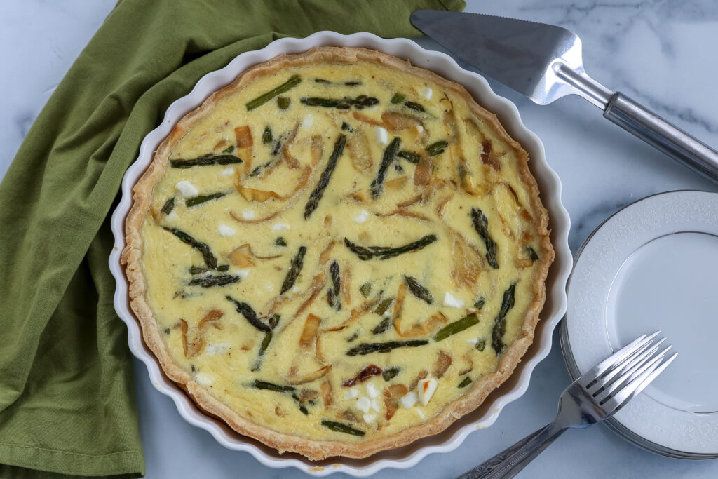 The perfect spring quiche, filled with asparagus, caramelized onions, and goat cheese.