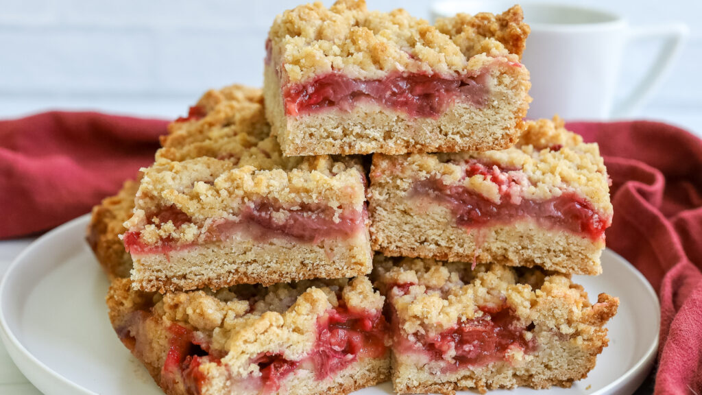 For me, it's officially Spring when Rhubarb comes into season and I can find it at a local farmstand. And finally, about two weeks ago it started showing up. Some people aren't fans of the tartness of rhubarb, but paired with sweet fruits its one of my favorite things. Strawberries and rhubarb are a classic pairing, and for these strawberry rhubarb crumble bars they are the perfect balance of flavors. Packed with sweet strawberries, tart rhubarb, and a buttery graham cracker topping, these bars are the ultimate treat for any occasion. Each bite is a delightful explosion of flavors and textures that will have you coming back for more. Whether you're craving a sweet afternoon snack or planning a summer picnic, these bars are sure to be a hit with family and friends.