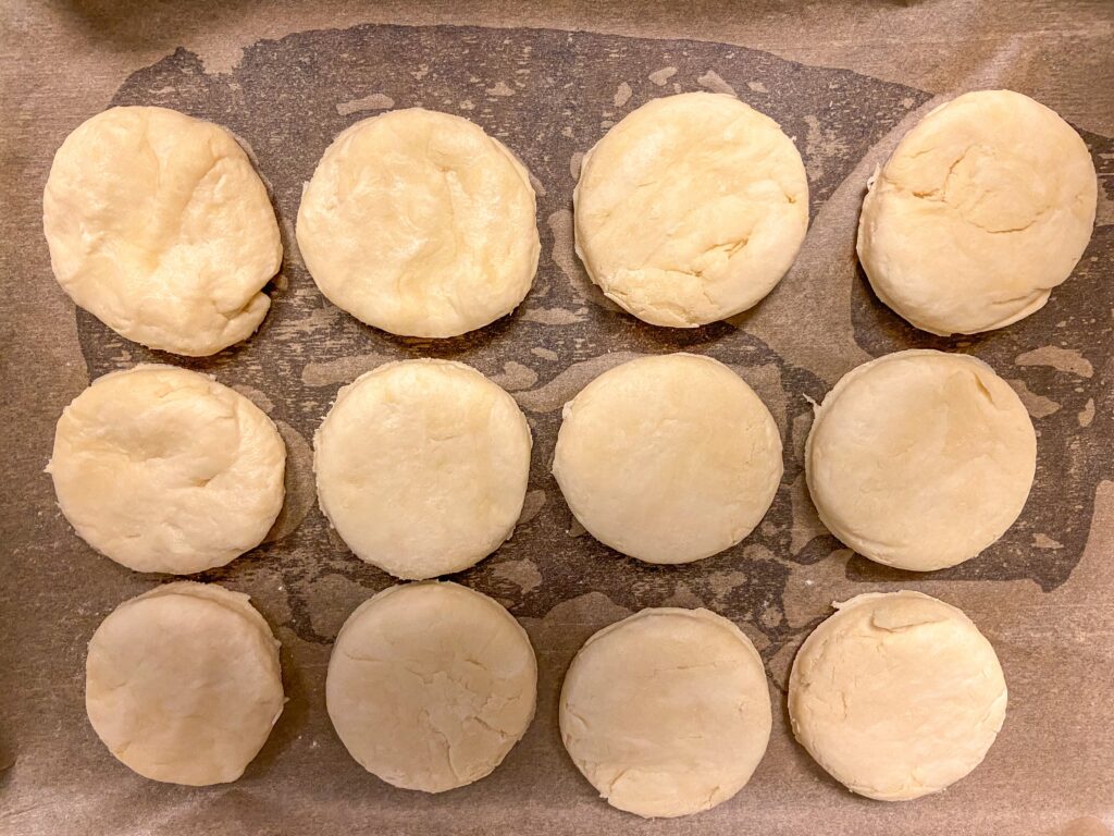 - Place the rounds onto the prepared cookie sheet and bake in the preheated oven for 10-12 minutes until the biscuits are golden brown.