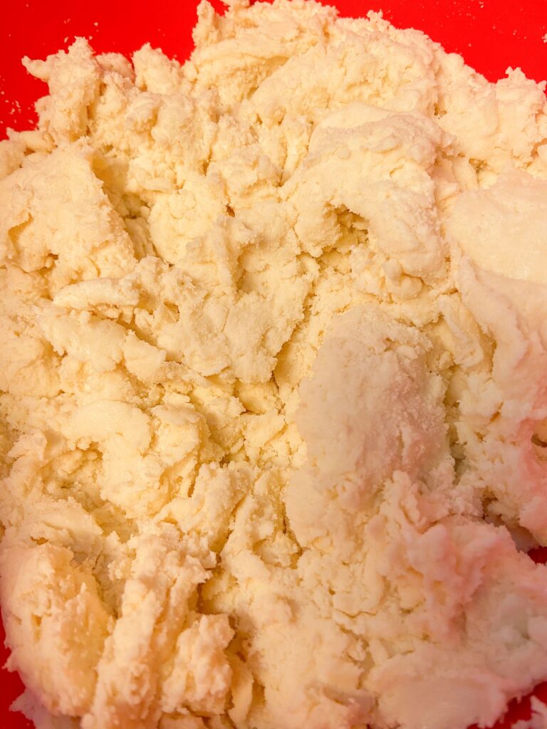 Then I pour the dough into a mixing bowl, and add in the buttermilk and mix until the dough gets shaggy.