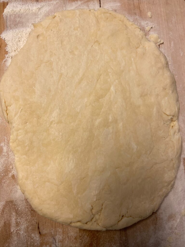 Gather the dough into a ball, kneading it a bit to make smooth, I put the dough ball onto a lightly floured surface, and press it into an oval, about ¾ inch thick.